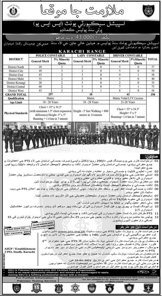 Sindh Police recently announced the Jobs for the Police Constable , Lady Constable, and Driver Constable with specified Requirement , There will a test conducted by the PTS and the qualifiers of latest Special Security Unit Jobs of Sindh have to pass the physical and written test. Both male and female are eligible for latest Jobs in Sindh Police 2021. Candidates Can Apply for the Jobs by following the Procedure described for Latest Jobs In SSU 2021 at website : www.pts.org.pk / Follow the Method of advertisement .