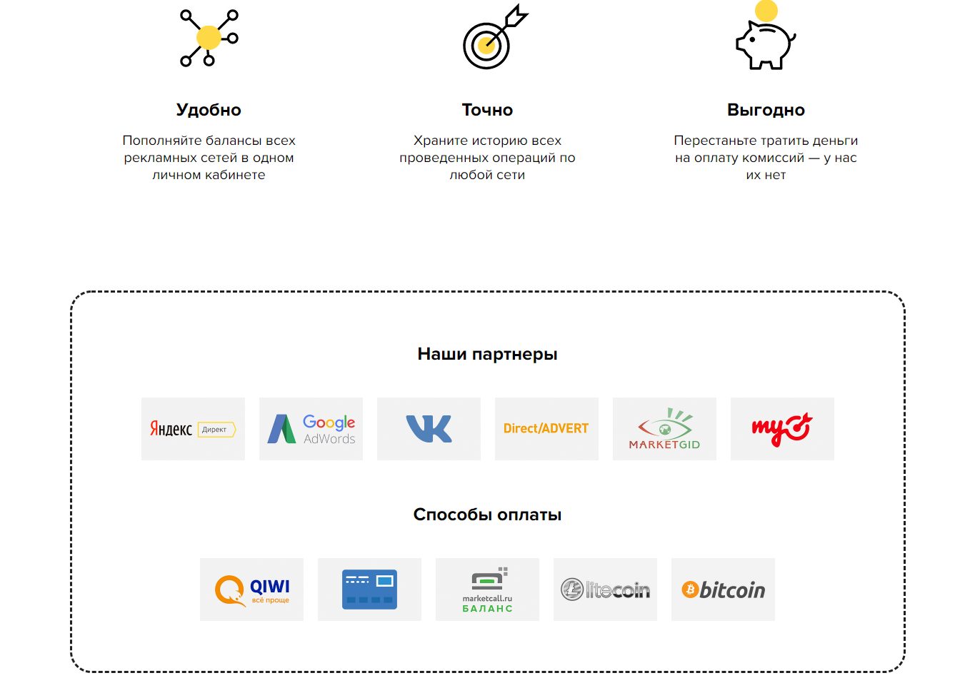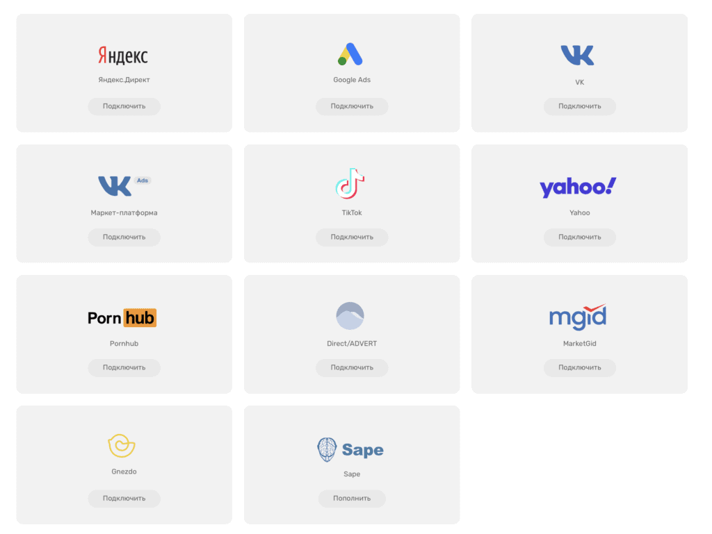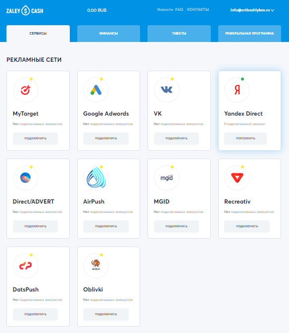 Nice and concise design service allows you to replenish the balance of 12 sites: VKontakte – advertising in communities and VK target platform, Direct / Advert, Tik Tok, Gnezdo, Google ADS, Maytarget, Marketguide, Pornohub Yahoo, Sape. Register via email or affiliate program Admitad – You must have access to your account. Payment is accepted through PayPal, bank cards, Qiwi, Webmoney. You can top up your accounts with the amount received from the referral program.