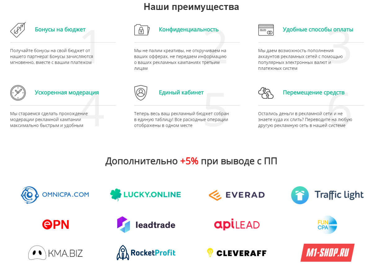 The developers of the project promise to pay 5-15% cashback when filling out an advertising account on VKontakte, Google Adword, Yandex.Direct, Mytarget desktop and mabail. Accepted bank cards, WebMoney, Yandex.Money, Qiwi. Services are provided by webmasters, branches, advertising agencies. G.Adword cashback – 10%, VKontakte – 5%, Mytarget – 5% for desktop and 1k1 mobile. The minimum refill amount is 5000 rubles. Periodically, promotional codes are raffled with a 10% surcharge, with a refill amount of 10,000 rubles.