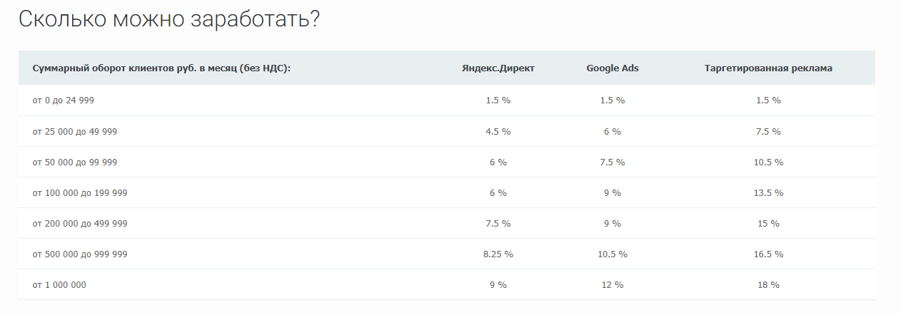 Works with contextual advertising Google Adword, Yandex.Direct, targeted networks Mytarget, VKontakte, Direct / Adwords, Marketgid. Up to 30% of the cashback amount. Bonus for contextual networks 2-5% depending on the amount of replenishment, at least 300 rubles. It is possible to transfer cryptocurrency, funds from Portmone, WebMoney, Yandex.Money e-wallets, bank cards, mobile phones, internal balance – a fee to attract new customers.